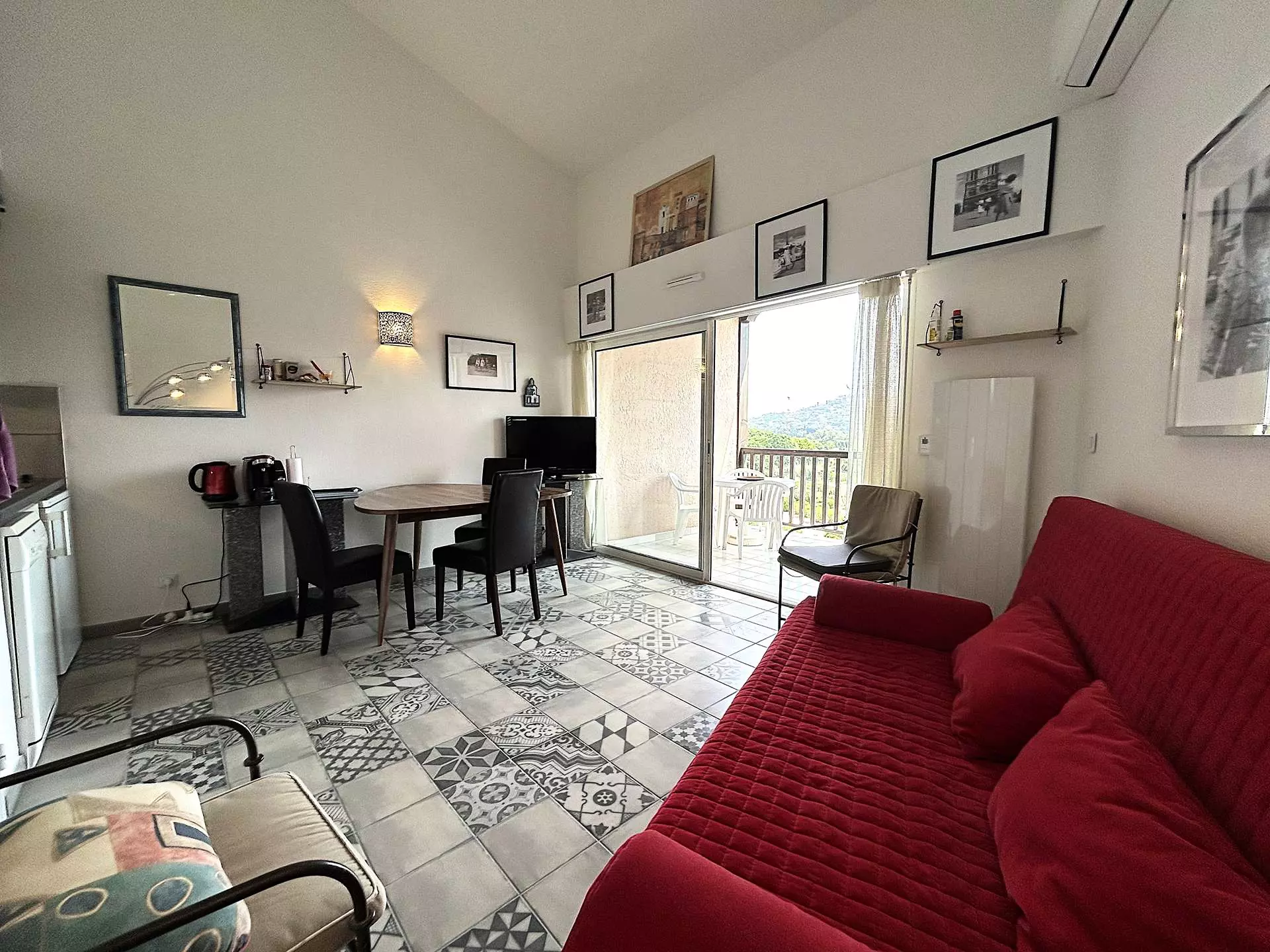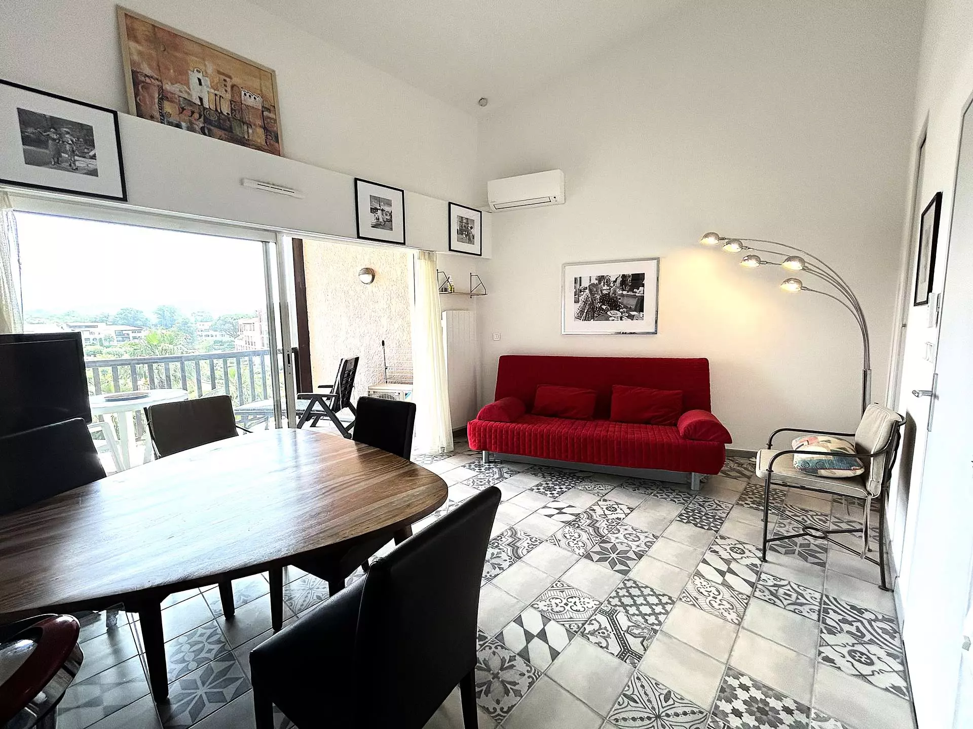 Un séjour lumineux climatisé avec canapé-lit